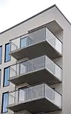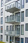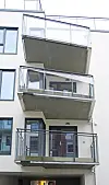 Næringsarealene mot Damsgårdsveien har en glassfasade på totalt 316 kvadratmeter. Balkonger mot Michael Krohns gate vil bli innglasset for å unngå støy. Balkongene er utført som prefabrikkerte betongelementer, og terrasser har plattinger av Kebony.