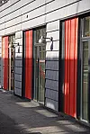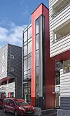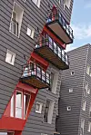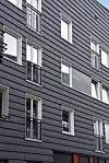 Takene på punkthusene skrår akterover og sideveis. De bæres av q-dekker og har folietekking. Fasadene er kledd med mørkegrå takstein av tegl, med rød plate-kledning som kontrast.