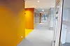 Innenfor hovedinngangen er det også lagt vekt på fargebruk og innbydende utforming av trapp og rekkverk. Det skal ikke være noen resepsjon i dette bygget. Det er lagt opp til at kunder varsler sin ankomst og blir hentet.