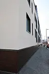 På fasadene har arkitekt gått for materialer som krever svært lite vedlikehold. Som hovedmateriale er det valgt fasadeplater med Weber-pussystem. I den øverste og nederste delen av bygget er det valgt gjennomfargede høytrykkslaminat panel fra Fundermax.