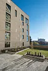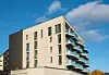 – Den grunnleggende geometrien i en trekantet tomt, gjør det mulig å jobbe i flere retninger. Men vi ønsket også å ha en variasjon i fasaden. Derfor er det lagt inn skråstilte fronter i balkongene med glassrekkverk. Det er blitt et ryddig prosjekt, stramt og med få vindusformater med en enkel vindusplassering i forhold til hverandre, forteller Høglund.