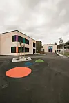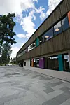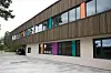 Skolens fasade er en blanding av tegl og trepanel med mange innslag av fargerike fasadeplater. En velbrukt fargepalett kan man også se igjen inne på skolen.