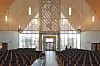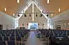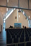 Kirkerommet har cirka 500 sitteplasser i form av løse stoler. Frontvegg (mot øst) og sidevegger i kirkerommet er hvite, mens vestveggen er i glass. I de skråstilte himlingene er det spilekledning av lasert furu. Kirketårnet går fra gulvet i kirkerommet og når opp til 42 meter, med spir. Kirkerommet er 19 meter høyt.