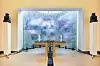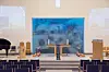 Kirketårnet er utført i betong-elementer og stål. Altertavlen er i glass og laget av Thomas Hestvoll. Seks buede glassplater som totalt utgjør et felt på 6x4 meter er påført silikon og knust glass. Motivet i tavlen er et Google-map bilde av hagen i Getsemane.