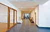Det er flis på gulv i kirkerom, storkjøkken og korridorer, menighetssalen har enstavsparkett, mens det er teppeflis i kontordel. I kirkerommet er det vegger av slemmet tegl og spilehimling.