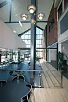 Rehabiliteringen av eksisterende bygg har blant annet bestått av nye arbeidsplasser for lærerne, administrasjon, nytt inngangsparti og vestibyle, kantine og opprusting av tekniske anlegg. Biblioteket er bokstavelig talt trukket frem i lyset, og ligger rett ved hovedinngangen. Valget av store glassfasader gjør at alle fellesområdene oppfattes som lyse og trivelige. Kantinen er utvidet og flyttet. I tillegg har man bygget en frittstående mesanin i andre etasje som svever ut i spiserommet.
