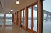Veggen som vender mot hagen har fem dører, og det er tanken at man skal kunne åpne alle fem og ha en seremoni ute i gårdsrommet sommerstid. Fasaden mot vest er en lett glasskonstruksjon som kan flyttes utover ved et mulig senere behov for en ovn nummer to.