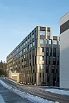 over fra bakkenivå. Mens de to første byggetrinnene har lyse fasader, men med mørke fasader vendt inn mot det indre gårdsrommet, er fargevalget her motsatt. Fasadene inn mot gårdsrommet er hvite og bidrar til å reflektere dagslys inn i arealene.