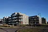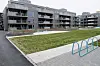 Det er etablert et stort uteområde med grøntarealer og lekeapparater mellom blokkene.