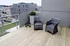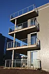 Balkongrekkverkene er delvis i glass, og delvis med tette felt, mens balkonggulvet har trykkimpregnert tre.