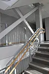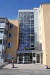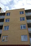 Fasaden er hovedsakelig i teglstein, og i de vertikale feltene er det stopuss. På innsiden er vindusbrettene i granitt. Designen er tiltalende på alle måter. Et minus er innkjøringen til garasje-anlegget som med fordel kunne ha vært bredere.