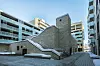 Fasaden inne på terrassene er utført i gyllent oljebeiset tre. Dette gir et kontrasterende og varmt element i en verden av tegl og glass.