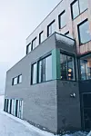 Utvending er det fasadekledning i Kebony i de øverste etasjene, og teglstein i første og andre etasje samt i den ene enden av bygget.