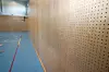 Inne i selve hallen blir man slått av hvor god akustikk det er der inne. Her har entreprenøren valgt en løsning med perforerte treplater som demper lyden på en utmerket måte. De samme platene er for øvrig brukt i auditoriet.