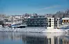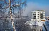 En del av lettheten i designet ligger i store vindusflater, som både slipper inn dagslys til boenhetene, men som også gir prosjektet et skinnende og speilende uttrykk der det ligger nærmest uti Vorma.