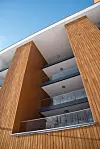 Det femetasjes bygget har tradisjonell bæring med betong, stål og plattendekker. Balkonger og trapper er prefabrikkerte. Ytterveggene er i bindingsverk, utlektet for Cembritplater. Vertikale stolper med MøreRoyal på svalgangssiden og på garasjeveggen står som en kontrast til det lyse uttrykket.