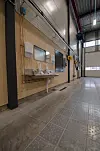 En spesiell leveranse her er noen robuste stålfliser i gulvet som gjør at slitasje fra beltehjul, tunge piggdekk og kjetting blir minimert inne i hallene, som Veidekke valgte etter å ha vært på befaring hos Pon Equipment i Skedsmo.