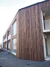 Bygget er kledd med royalimpregnert trekledning med innslag av sementbaserte fasadeplater. Arkitektonisk har det blitt lagt vekt på at bygget ikke skal være prangende hverken i form eller farge.