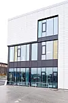 – Utformingen tar hensyn til omkringliggende bygg, men har samtidig egen identitet med sine hvite fasader og store glassfelt. Mot Foldnesvegen er fasadeuttrykket enkelt med et høyreist hjørne som er lett å se fra veien. Mot Blombakkane, som er atkomstveien til senteret, er fasadene derimot artikulert og oppdelt. Her er balkonger og terrasser, slik at bygget skal ta imot besøkende på en vennlig og inviterende måte. Det er romslig plass for av- og påstigning, utearealene har gode overflater og ikke minst en i øyenfallende utvendig skulptur, skapt av Turid Uldal. Bygningen har en U-form. Dette gir skjerming mot nord, en fin tundannelse og forbindelse til terapibadet. Fra tunet har man god oversikt over anlegget, og hovedinngangen er fremhevet med fargede glassplater, sier Bech.