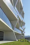 Balkongelementene er trapesformede og montert speilvendt mot hverandre, både i horisontal og vertikal retning.