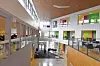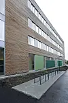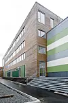 – I knutepunktet mellom eksisterende og nytt er det et større dobbelt volum med store glassfasader der kommunikasjonsveier, kantine og takterrasse møtes. Hovedinngangen har blitt utvidet med en større sluse og utvendig rampe/trapp har blitt tilpasset den nye inngangen. Utvendig er det etablert ny parkeringsplass slik at skoleplassen, som til nå har fungert som parkeringsplass, har blitt frigjort til uteareal for elever og ansatte, sier McConnachie.