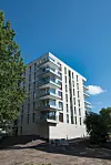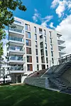 Det lette uttrykket forsterkes gjennom de lyse teglfasadene, og en markert detaljering ved vinduer og balkongoverganger.
