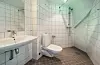 På grunn av utforming og skråtak er det plassbygde bad kun i sjuende etasje. Prefabrikkerte bad er ikke vanlige i et rehabprosjekt, men det var en mulighet til å få heist dem gjennom den nye trappa. Det ble laget nye åpninger opp til sjuende etasje, med plattinger videre inn i bygget.