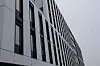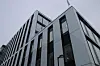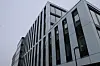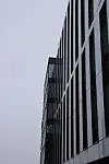 Det «svevende» volumet i fem etasjer fremstår enkelt og tidsriktig med hvite glassfasader og mørke, vertikale vindusslisser.