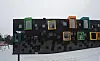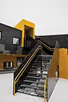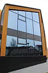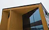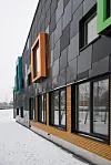 På veggen er det brukt steniplater lagt i samme mønster og format som solcellepanelene. For å få spill i fasaden er det brukt plater med noe ulik glans og farge. Enkelte steder i ytterveggen er fasadeplatene erstatter av vinduer, som dermed også er en integrert del av fasadekonseptet. Dette bød på noen utfordringer: