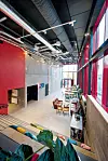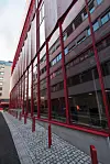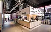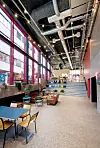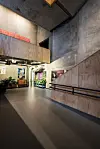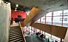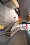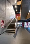 Foruten eksponert betong er det brukt kryssfinerplater både i vegger, i betjeningskiosken i restauranten og i rekkverkene i trappehus, ramper og bruer. På vei oppover i bygget er det en intensjon at oppstigningen skal være en opplevelse, med mange steder å oppholde seg på.