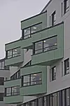 elementer opp til og med sjette etasje. Sjuende etasje har klima-vegger med grønn platekledning. Ved kafeen i første etasje er det glassfasade.