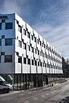 Ottestad forteller at det i plan en er benyttet glassfasader mot nord, sør og vest, mens mot øst er det benyttet sandwichvegger som er utlektet med sorte Alocobuond plater.