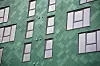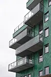 – Vi hadde som nevnt et ønske om å tilføre et materiale/farge ut fra tanken om å la teglfasaden fremstå som det mest fremtredende i byggeriet. Vi så på flere ulike plateløsninger og landet på en aluminiumsfasade i diagonalmønster. Dette konseptet arbeidet vi så videre med sammen med den lokale kunstneren Line Hvoslef. Det ble testet ulike farger og ulike mønstre før vi landet på tre forskjellige grønnfarger som beveger seg fra det mørke til det lyse oppover i fasaden. Den mørke grønnfargen er tatt ut for å stå fint til den mørke røde fasadeteglen i eksisterende fasade i Damsgårdsveien. Den lyseste grønnfargen er mer blekgrønn og står til det bleke bladverket i Hagtornaleen i Michael Krohns gate, sier Jorde.