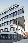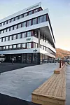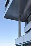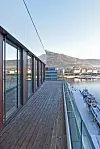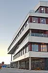 – Fasadene er en kombinasjon av hvite glassplater, sjøvannsbestandig aluminium og med innslag av finerplater. Glassplatene er malt på baksiden slik at de fremstår helt hvite med glanset dybde. Balkonger har et varmt/gyllent tregulv og himlinger i sjøvannsbestandig aluminium som slik sett forsterker og underbygger bygget horisontale uttrykk. Første etasje har full eksponering mot omgivelsene. Her er glass fra tak til gulv. Gulvet i kafeen er som et lyst teppe og dermed blir overgangen mellom inne og ute utvisket, hvilket underbygger ønsket om et inviterende bygg, sier Nielsen.