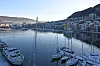 Forplassen har fått en materialbruk som matcher materialbruken på eksisterende havnepromenade med treverk, plasstøpt hvit betong, møblert med pullerter og overganger av cortenstål.