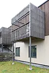 Bygget er svakt vinklet og har bærende konstruksjon av plasstøpt betong og tre. Taket er flatt og fylt med solcellepaneler. Fasadene er kledd med royalimpregnert panel. Det er industriparkett på gulv i stue, spisestue og kjøkken, flis i trapperom og belegg i personalavdeling. Det er spilehimling i entre, korridor, spisestue og kjøkken. Balkongene har både rekkverk og sidevegger av spiler.