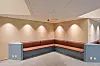 – Farge på dører og vinduer er avdempet farge med grønt innslag. Vi har valgt å holde et rolig fargespill i fasadene. Bygningen ligger ved fjorden, er godt synlig, vi tenker at natur og mennesker kan være fargeklatter. I interiøret fremtrer et større fargespekter. Her har vi ønsket å bidra til hjemlighet, identitet og orientering. Fargene balanserer tydelighet og ro. Spesielt korridorer har vi behandlet med variasjon i fargebruken, med tanke på hygge, gjenkjennelse og hjelp til å orientere seg. Det er vesentlig innslag av hvitpigmentert furukledning som gir interiøret en lun atmosfære. Ekstra materialkvalitet finnes i granittgulv i kafe og seremonirom, tregulv i møterom og trespilehimling i kafe og bårerom. Beboerrom og stuer har innslag av hvitpigmentert tre, sier Bech.