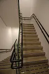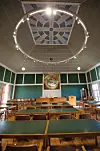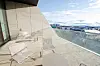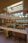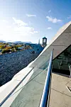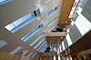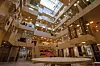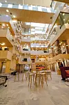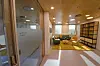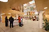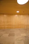 Gulvet er dekket i skifer fra Oppdal, det lyse og åpne rommet er kledd med til sammen 2.200 veggpaneler og 18.666 himlingsplater i askefinér. I tillegg er det svært mye glass som gir gode siktlinjer og en åpen følelse i hele bygget.