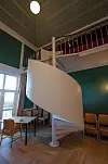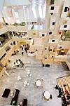 Noe av det første som treffer besøkende til Bodø rådhus når de kommer inn den nye hovedinngangen, er et rom som åpner seg opp fra første etasje og helt opp til taket mer enn 30 meter oppe. Seks etasjer åpner seg opp mot det luftige og spreke atriet, og to gangbruer krysser det store rommet oppe under skråtaket.