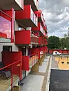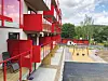 – Små forskyvninger sørger for et dynamisk og lekent utrykk som spesielt på endene gir inntrykk av bevegelse. Fasaden mot Ammerudgrenda er brutt opp i tre deler, markert med vertikale innskjæringer i bygningsvolumet. Hvert av de to «kuttene» ender i et kvadratisk inngangsparti, som igjen refererer til naboen, sier Deliz.