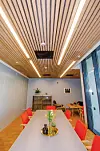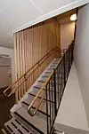 Spesielt fellesarealene er pent utsmykket med trespiler i himlingene og i veggene, seksjoner med slipt betonggulv og terrazzofliser i trappen. Det er også brukt treullsementplater i enkelte av himlingene.