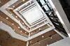 Det store glassatriet skal bidra til å optimalisere lysforholdene i bygget. Trappen fra første til sjette etasje er også hovedferdselsåre for studentene, og rømningsvei.