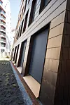 Prosjekter bærer preg av robuste materialer med høy kvalitet både på eksteriør og interiør. Hovedfasadene er kledt med tegl, og i bygården er det en gylden skråfasade i metall.