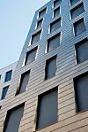 På metallfasaden i bygården har de jobbet tett med leverandør for å få til skjult innfesting. Fasaden endrer karakter og uttrykk i takt med lysforholdene.