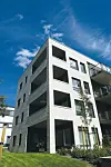 Råbygget til komplekset består av plattendekker, stål og betong. Baderommene og ytterveggene er plassbygde. Fasaden er dekket med lys, smakfull tegl samt mørk trepanel.