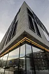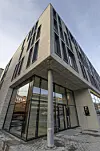 Det fem etasjer høye nye kontorbygget i Hoffsveien på Skøyen i Oslo fremstår som et friskt og smakfullt nytt innslag langs veien mot Smestad. Fasadene er forblendet med naturstein og lys grå teglstein, bygget preges av store vinduer med karmer som gjør at vindusrutene popper ut av fasaden, og en stripe av lys setter en solid strek under inntrykket av at dette er et kontorbygg hvor man har satset.
