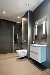 Det er rennesluk i de fleste baderom, dusj av typen rainfall, høy kvalitet på fliser, HTH-kjøkken, solskjerming i alle leiligheter, garderobeskap og grunnbelysning. Dype vindusposter er forsterket slik at de tåler å sittes på.