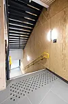 For å klare lydkravene er alle massivtre-dekkene foret opp med trinnlydmatter, belagt med matter for innfesting av den vannbårne gulvvarmen pluss påstøp – alt ti centimeter.