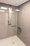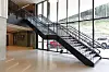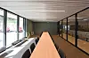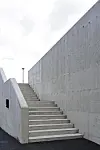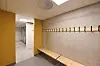– Taket er tekket med svart folie med innlagte renner i takflaten. Rennene lager et mønster i takflaten for å bryte denne opp. Deler av fasaden er kledt med stående spaltepanel i tre for å tilføre naturlige material i fasade nær bakken. Innvendig er hovedmaterialer synlige betongflater og slipt betonggulv. Innvendige vegger og himlinger er kledt med spaltepanel i furu med ulike bredder. Panelet er behandlet med hvitpigmentert overflate som bidrar til et lyst inntrykk. I tillegg er det valgt elementer i svart stål for rekkverk og trapper, samt innvendige dører og vinduskarmer. Garderober har flislagte vegger og gulv i dusjer, mens vegger forøvrig er synlig betong med innslag av malte flater på lettvegger. Garderobene skilles ved ulike farger innvendig, sier Slettebø.