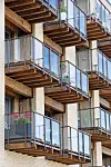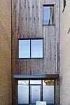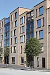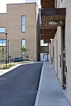 – Fløyen langs Hamneveien har en horisontal aksentuering av fasaden der den trapper seg nedover bakken mot eksisterende nabo. Fasaden nordover langs Hillevågsveien er en sekvens av vertikale parti som veksler mellom to nyanser av tegl og innglassede balkonger konstruert med limtre. Balkonger mot bygatene er bygget som nisjer inn i bygningskroppen slik at de ikke stikker ut fra fasadeliv. Balkongene på østsiden, med utsikt mot Ryfylke og den grønne parken som dannes inne i kvartalet, krager ut fra fasaden med bjelkelag av limtre, sier Djønne.